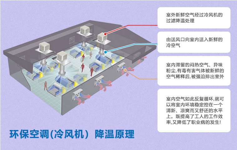 在空氣不流通的環(huán)境中,尤其是化工車間,容易產(chǎn)生建筑綜合癥,如悶熱、頭疼、眩暈、過敏、咳嗽等不適癥狀。使用環(huán)保空調(diào)(冷風(fēng)機(jī))通風(fēng)降溫方案即可以有效降溫,又能保證空氣流通